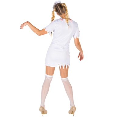 Zombiedräkten är garanterat ett blodigt blickfång på maskeraden eller halloween. Zombie-sjuksköterskans patienter måste tåla en hård behandling, vilket blodspåren på dräkten visar. Klänningen har en snygg genomgående dragkedja fram. Dessutom medföljer två knästrumpor med otäcka blodstänk – samt ett munskydd och ett diadem med det röda korstecknet. Tveka inte, utan kasta dig in i nästa maskerad- eller halloweenparty i denna snygga sjuksköterskedräkt med zombieinfluenser.