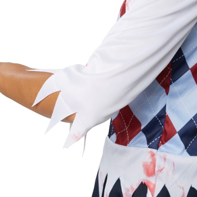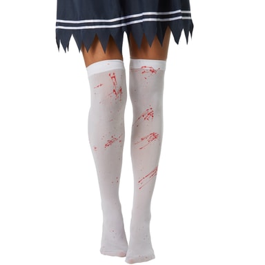 Damdräkten Kuslig skolflicka består av en slipover-liknande överdel med rutigt mönster. De påsydda skjortdelarna är fransiga på ändarna och med blodstänk. Den tillhörande kjolen med resår har påsydda ränder i två rader på fållen och är även den fransig. För en speciell look innehåller dräkten en kravatt med resår som kan hängas runt halsen samt knästrumpor med blodstänk, material 100 % polyester.