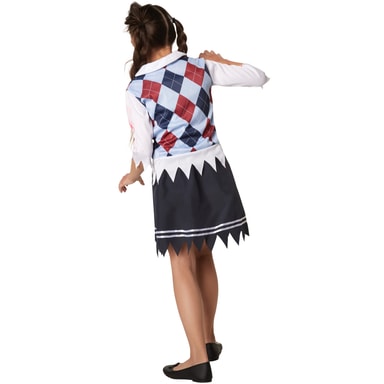 Den tredelade flickdräkten Kuslig skolflicka består av en överdel, en kjol samt en slips som fästs med resår. Överdelen är tillverkad i ett stycke. Blusen med påsydd rutig slipover är fransig vid ärmarna samt vid fållen. Den typiska bluskragen och hela överdelen är nedfläckade med blod. Kjolen med resår är också fransig vid fållen och har två vita påsydda dekorband nedtill, material: 100 % polyester.