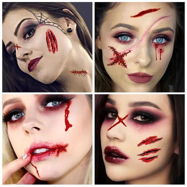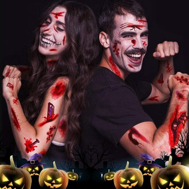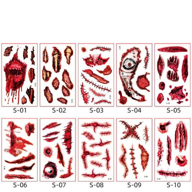 Perfekt till maskeraden: Klä ut dig riktigt läskigt med en mängd olika obehagliga tatueringar i form av sår och blod. Kan sättas fast på vilken kroppsdel som helst.