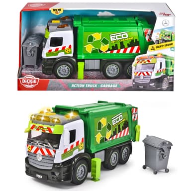 Med friktionsmotor, ljus, ljud och rörliga delar inklusive soptunna.