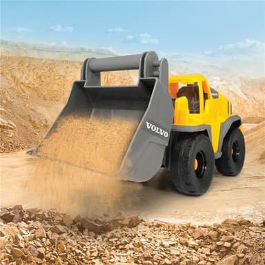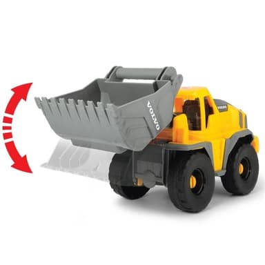 En häftig hjullastaren från Dickie i Volvomodell med frihjul och öppningsbar förarhytt. Skåparmen är rörlig och går att lasta och tippas.