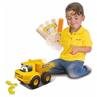 En rolig och spännande R/C Truck med fungerande flak. Trafikstaven fungerar som fjärrkontroll. Tryck på 'pil framåt' för att styra lastbilen. En rörelsesensor fångar signalen och styr lastbilen till höger eller vänster, beroende på hur du pekar med trafikstaven. Staven lyser och spelar rolig musik. Dra tillbaka flaket för hand för att lossa lasten.