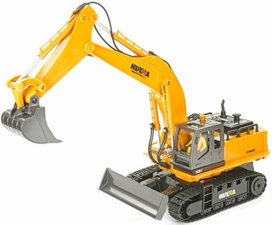 Huina här med en grävmaskin som kör framåt, bakåt, höger, vänster, tornet snurrar hela 680 grader, upp och ner med skopan. Den är även utrustad med ljus och ljud förutom en förare.Läs mer om produkten