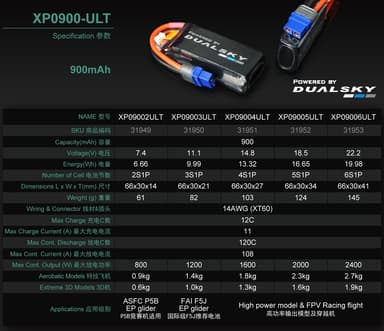 3S LiPo-batteri från Dualsky med hela 120C! Batteriet levereras med 900mah, XT60-kontakt, väger 82g och har måtten 66x30x21mm.Läs mer om produkten