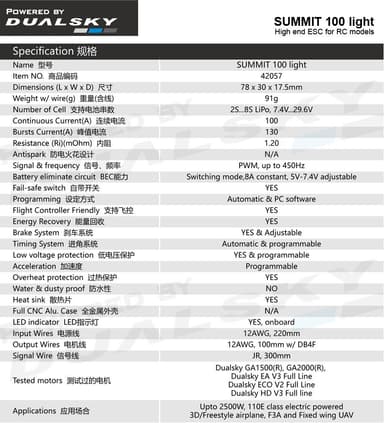 Dualsky Summit 100 Light 100A ESC 2-8S UBec