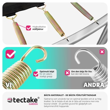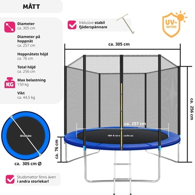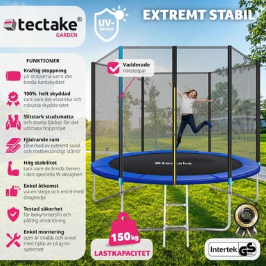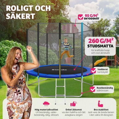 Denna studsmatta med skyddsnät blir snabbt familjens favorit! Med hög spänst och starka stålfjädrar garanterar den maximal hoppglädje.Läs mer om produkten
