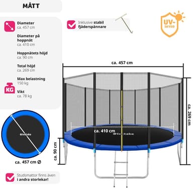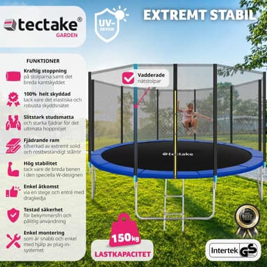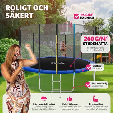 Denna studsmatta med skyddsnät blir snabbt familjens favorit! Med hög spänst och starka stålfjädrar garanterar den maximal hoppglädje. Visa familj och vänner hur högt du kan nå! Vår studsmatta prioriterar säkerhet med stabil stålrörsställning, kantskydd och skyddsnät. Skyddsnätet har en dragskedja för enkel tillgång och extra säkerhet samtidigt som W-benen ger stabilitet, även under vilda hopp. Studsmattan är enkelt att montera och står snabbt redo. Utforska vårt breda sortiment av studsmattor, trampoliner, hoppborgar, utomhusleksaker, fritidsprodukter, leksaker, sport-utrustning, lekredskap, utomhusaktiviteter, skyddsnätstudsmattor. Köp din nya studsmatta idag hos tectake!