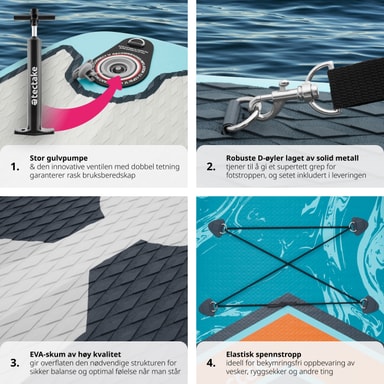 Tack vare det toppmoderna Drop-Stitch-material, erbjuder brädan enastående stabilitet och hållbarhet. Med en imponerande lastkapacitet är den uppblåsbara brädan extremt tåligt och mångsidigt. Den 2i1 universella paddeln av aluminium, som är steglöst justerbart i längd, anpassar sig dessutom perfekt till dina behov.