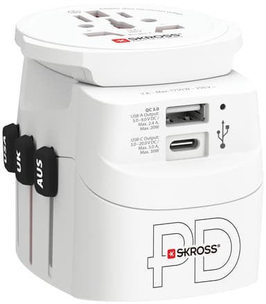 Var du än är i världen kan du med denna 3-poliga SKross Pro Light USB-A/USB-C 30PD reseadapter 3310225 ansluta och ladda dina enheter oavsett om de har en elkontakt eller en USB-C- eller USB-A-port.Läs mer om produkten