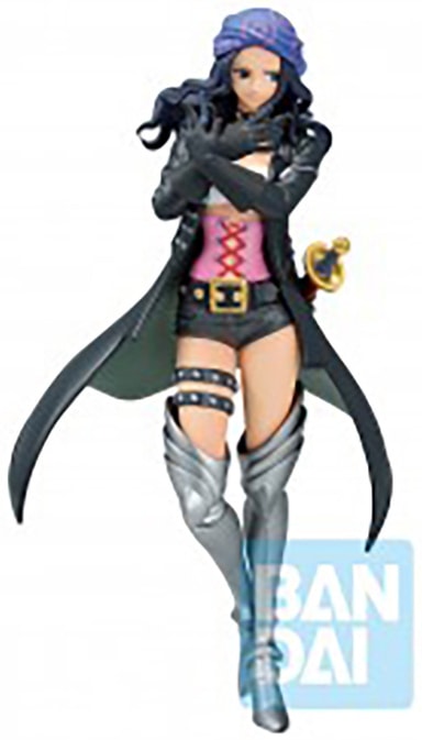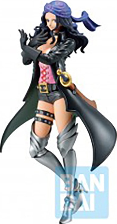 Banpresto One Piece actionfigur föreställer Nico Robin Michibansho, en populär karaktär från One Piece-serien som är klädd i en snygg outfit med en rosa korsettopp, en svart jacka, handskar och en mönstrad hatt.Läs mer om produkten