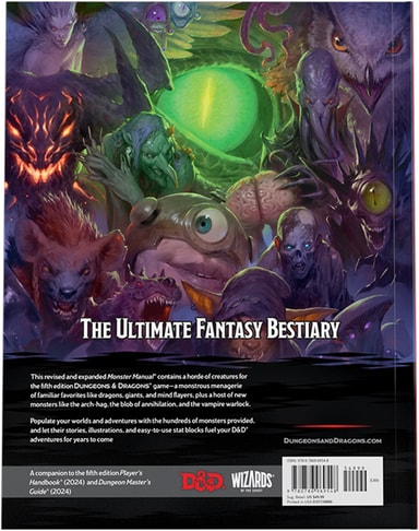 Dungeons & Dragons 2024 Dungeon Monster manual utökad med över 500 varelser, omdesignade, lättanvända stat-block som inkluderar utrustning/skatter/habitat, nya monster med högt CR-värde och förnyade NPC-block för större variation.Läs mer om produkten