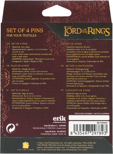 Grupo Erik Ringens Herre-textilnålar fångar element från Sagan om Ringen-serien, vilket gör dem perfekta för fans och samlare. Den har 4 intrikat designade stift tillverkade av zinklegering med emalj och har en push-back stängning.Läs mer om produkten