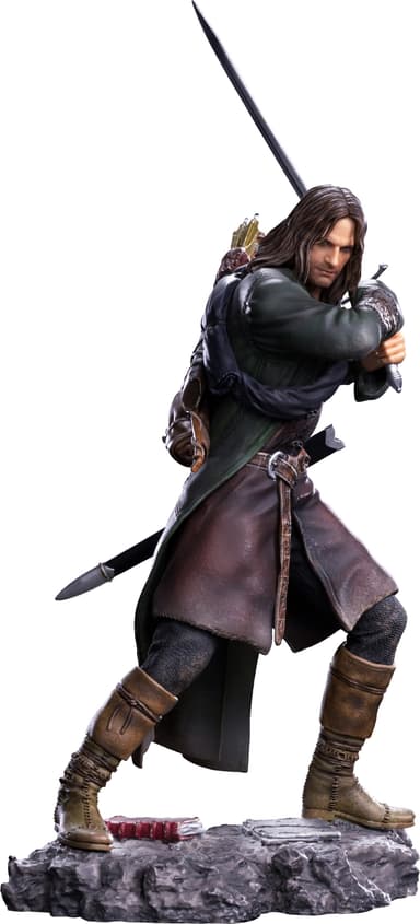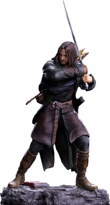 Lägg till essensen av Midgård i ditt hem med actionfiguren Iron Studios Lord Of The Rings. Den här 24 cm höga figuren visar Aragorn stående på en bas med böcker och tidskrifter fallna vid hans fötter. Hans svärd höjs och hålls med hårda knytnävar.Läs mer om produkten