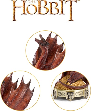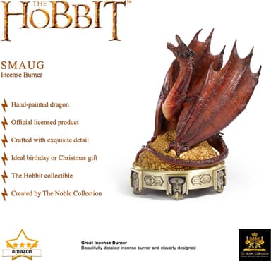 Visa den pyrande Smaug med denna rökelsehållare från Noble Collection inspirerad av Hobbit-serien. Perfekt för alla rollspelsälskares tillhåll, denna handmålade staty har en plats för att bränna rökelse i Smaugs käftar.Läs mer om produkten
