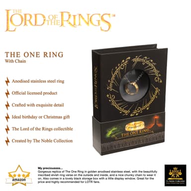 Bär kraftens källa ständigt med dig i ett halsband från Noble Collections Sagan om ringen-kollektion. Denna filmtrogna kopia av The One Ring i rostfritt stål levereras med en 60 cm lång kedja och en samlarlåda.Läs mer om produkten