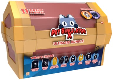 Play Pet Simulator Ultimate Bundle leksakset innehåller en stor, skattkistaformad låda med föremål som Collector Poster, Sticker Sheet, Exclusive Golden Egg, Mystery Eggs x2, Gold Plush etc.Läs mer om produkten