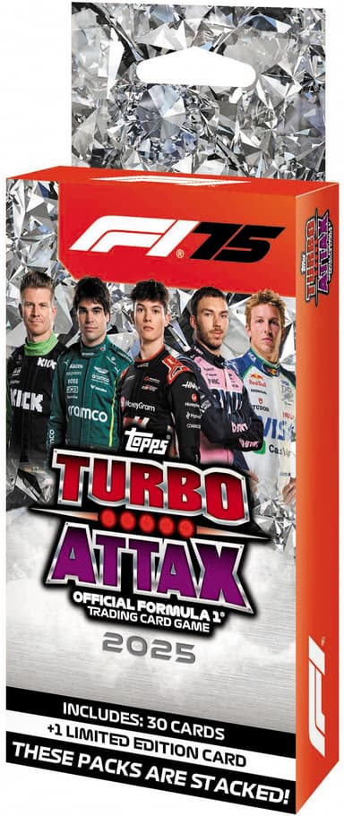 Samla på 2025 Topps Formula 1 Turbo Attax Eco-kort. Denna ask innehåller 31 kort med toppförare och ett speciellt limiterat kort. Ett perfekt sätt att fira F1:s 75-årsjubileum.Läs mer om produkten