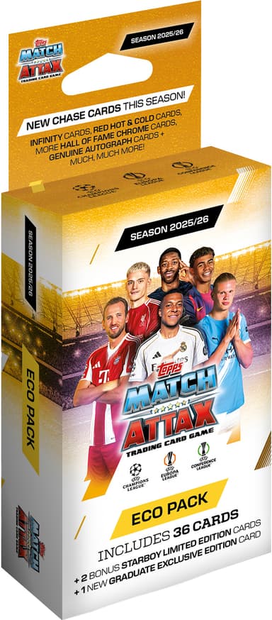 Topps Match Attax Champions League 2025/26 Eco Pack innehåller 36 kort plus 2 Starboy Limited Edition-kort och 1 Graduate Exclusive Edition-kort. De nya samlarbilderna innehåller Infinity, Red Hot & Cold, Hall of Fame Chrome och även autografkort.Läs mer om produkten