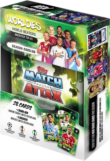 Topps Match Attax Champions League 2025/26 Booster spelkort innehåller 28 kort per ask, med temaset som International Icons, Global Goalscorers, Homegrown Heroes eller World Beaters. Varje ask innehåller 3 exklusiva kort i limiterad upplaga.Läs mer om produkten