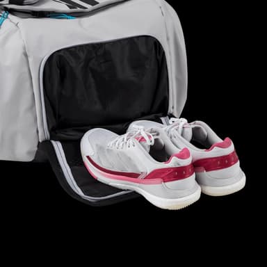 Den innovativa designen av padelväskan ger dig maximal funktionalitet och stil. Med ett stort centralt fack med dragkedja på bakpanelen kan du bekvämt förvara dina kläder och sportutrustning. Den har också två sidofickor med värmeisolering, perfekt för att skydda och bära dina racketar säkert och säkert. Det nedre facket med meshventilation gör att du kan förvara dina skor separat, vilket håller allt organiserat och svalt. Glöm inte den praktiska toppfickan, perfekt för dina mindre personliga föremål. Med en ny Martita Ortega hängetikett är den här ryggsäcken inte bara funktionell utan också ett måste-ha modeaccessoar.