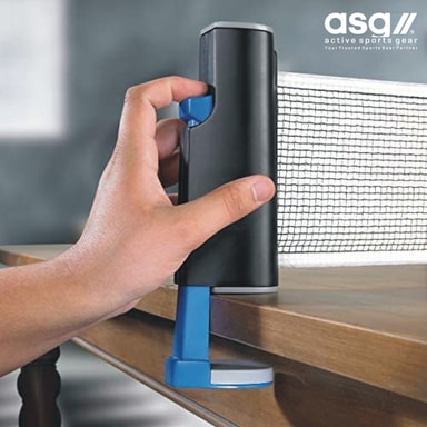 ASG pingisnät kan tillpassas de flesta ytor. Det är vikbart. Nättet är lätt att montera och fällas ihop. Nättets maximala längd är 1,67 meter och passar därför till alla pingisbord + De flesta bordytor. Nättet har en höjd på 14 cm, när det är satt upp. Produkten väger 520 gram. Emballagens storlek: 27,5x15x20 cm. Färg: Svart/Blå/Grå. Vi vet alla vad pingis är och hur kul man kan ha det! Om man spelar 1vs1, 2vs2 eller klassikeren, runt om bordet, så här kan ni få många timmar med underhållning. Med detta nät behöver du inte köpa ett bordpingis bord. Här kan du bara gå igång med att spela pingis på alla bord med detta Click-On nät som monteras på varje sida av bordet. Bjud in dina vänner och familj på en duel ihopa! Här sparar du på platsen. Här behöver du inte ett pingisbord utan bara ta det bordet du har där hemma. OBS, självklart så kan du använda det på trägårdsbordet.
