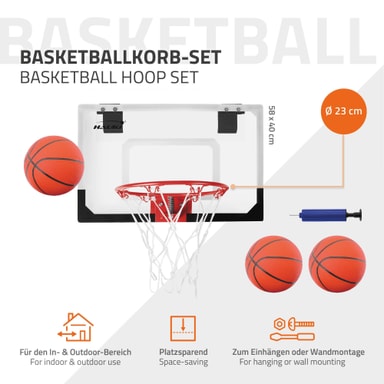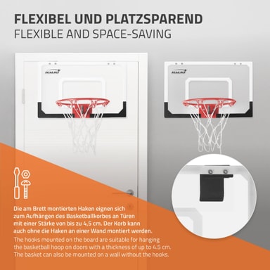 Hauki Mini basketkorg för rummet, set med 3 bollar Ø16 cm, nät, pump, 58x40 cm, vit, bärbar, monteringspanel för dörr/vägg, ingen borrning, upphängd basketkorg för vuxna/barnLäs mer om produkten