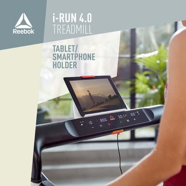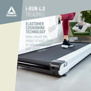 Med integrerad elastomer-dämpningsteknik hjälper det rymliga 125 (L) x 46 (W) cm löpardäcket till att absorbera stöten från varje steg för att minska buller och ledspänningar. Resulterar i en smidigare och mindre slitande löpplattform, elastomerteknologin ger större komfort och prestanda. I-Run 4.0 är även utrustad med en justerbar hållare för surfplattor/smarttelefoner och ökar din energi med musik och videor för att driva löpningen. Idealisk för att utmana dig själv genom träningsappar eller springa virtuellt genom natursköna rutter online, i-Run och dess mediastation låter dig gå med i onlinegemenskaper och driva din regim ytterligare.
