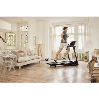 Inbyggda högtalare gör att du kan koppla in din smartphone så att du kan fördjupa dig i dina favoritträningsbanor medan du springer. Den justerbara fläkten hjälper till att hålla dig sval och efterliknar löpning utomhus. Håll dig hydrerad med de bekvämt placerade vattenflaskhållarna. När du är klar med träningen använder du den mjuka fällmekanismen för att vika bort löpardäcket och spara utrymme.