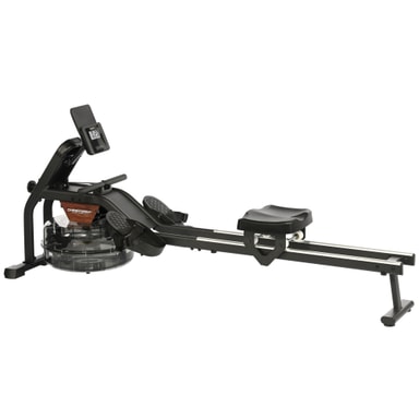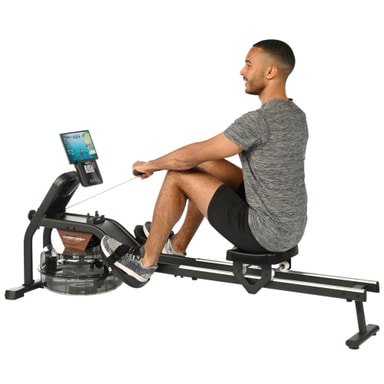 Den bekväma sitsens höjd på 37 cm gör det lätt att sätta sig på och kliva av. Den långa rodrälen i aluminium, det ergonomiska komfortsätet med kullager, och de säkra fotstöden med säkerhetsremmar garanterar jämn och säker träning för personer upp till en vikt av 120 kg. Den integrerade träningsdatorn fångar all viktig data, såsom träningstid, antal drag, distans, kaloriförbrukning, totala drag och din puls. LCD-skärmen är utrustad med en praktisk tablethållare så att du kan titta på filmer eller använda dina favoritappar medan du tränar.