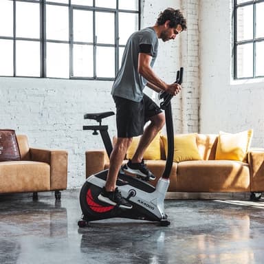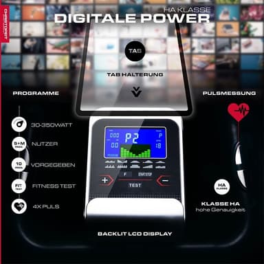 Top Sport AX 4000 Motionscykel är designad för att leverera en robust och stabil träningsupplevelse, och den kombinerar avancerad teknik med imponerande egenskaper. Kraftig ramkonstruktion för maximal stabilitet. Imponerande maximal användarvikt på 150 kg. Bekväm sadel, justerbar horisontellt, vertikalt och i lutning. Ergonomisk sittställning för användare upp till 195 cm. Slitfritt magnetiskt bromssystem för jämn körning. Datorstyrd magnetisk broms med 24 nivåer för finjustering. Bakgrundsbelyst LCD-skärm för lättlästa träningsdata. 21 träningsprogram, inklusive puls- och watt-specifikationer. Kompatibel med Kinomap-appen för interaktiv träning. Bluetooth®-gränssnitt för trådlös anslutning till enheter. Justerbara pedaler med pedalsäkerhetsremmar för optimal support. Surfplattshållare för underhållning under träningen. Gör träningen underhållande med Kinomap-appen och spara dina träningsdata. Möjlighet att integrera teknik och underhållning under din träning. Top Sport AX 4000 Motionscykel är inte bara en träningsmaskin; det är en investering i ditt välbefinnande med kraftfull prestanda och moderna funktioner. Specifikationer: Bromssystem: Elektroniskt magnetiskt Motståndsnivåer: 24 Watt/watt-intervall: 30-350/10 Svänghjul: Ca. 9 kg Dator: Ja Datordata: Km/t / tid / km / cal / RPM / watt / puls Träningsprogram: 21 st Hopfällbar: Nej Uppsatt storlek (LxBxH): 88 x 54 x 136 cm Pulsmätning: Ja i handtag Passar höjd: Upp till 195 cm Egenvikt: 28 kg Max. användarvikt: 150 kg