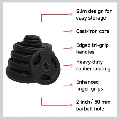 Tri-grip viktskivorna har ett 2 / 50mm hål designat för användning med olympiska skivstänger, hantlar och EZ curl stänger.