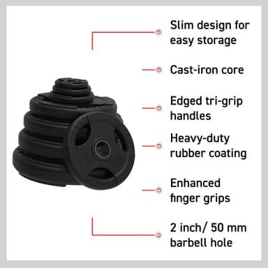 Tri grip-viktskivorna har ett 2""/50mm hål designat för användning med olympiska skivstänger, hantlar och EZ curl-stänger.