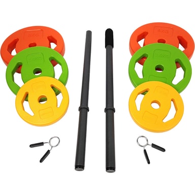 Skulle du vilja stärka dina muskler, men känner inte för att gå till gymmet varje dag? Inga problem. Med detta Tunturi skivstångs aerobic pumpset kan du enkelt träna hemma. Setet består av en metallstav med olika färgade plattor. Varje färg representerar olika vikt och setet har en maxvikt på 20 kg. Ett idealiskt set för pumpövningar och många andra övningar! Sammanfattningsspecifikationer: Delbar ihålig skivstång, 131,5 cm längd. Ytterdiameter största vikten: 27,5 cm. 6 vikter: Orange: 2 x 5 kg. | Grön: 2 x 2,5 kg. | Gul: 2 x 1,5 kg. Totalvikt: 20 kg. Innehåller 2 fjäder klämor