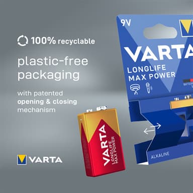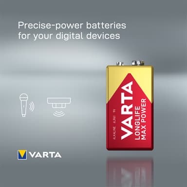 Varta Longlife Max Power 9V batteri ger pålitlig energi för krävande enheter som mikrofoner och rökdetektorer. Med smarta ikoner och ett praktiskt öppna-/stängpaket.Läs mer om produkten