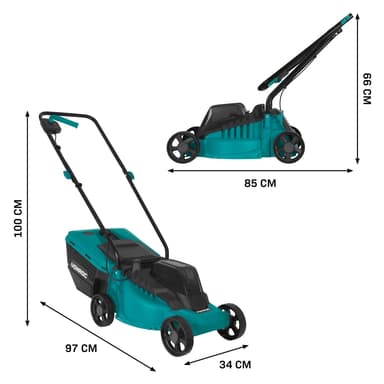 Gräsklipparen har ett höjdjusterbart handtag med ett lättmanövrerat på/av-reglage för bekväm klippning. Handtaget kan fällas ner, vilket gör maskinen kompakt och enkel att förvara. Ett integrerat bärhandtag gör det lätt att flytta den. Det robusta chassit är tillverkat av stöttålig plast och tål regelbunden användning. De stora hjulen är skonsamma mot gräset och ger bra rullning. För extra säkerhet finns en startnyckel och startspärr.