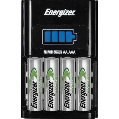 Energizer CH1HR3 Batteriladdare NiMH inkl. batteri AAA (R03), AA (R6)Den är mycket snabb – laddar upp till fyra AA- eller AAA-batterier på bara en timme Den laddar batterier hemma och i bilen LED-lampan för laddning visar när batterierna laddasLäs mer om produkten