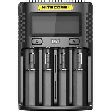 NiteCore UMS4 Batteriladdare NiCd, NiMH, LiIon, LiPo 10440, 10500, 12500, 12650, 13500, 13650, 14500, 14650, 16340, 166Mikroprocessorstyrd · avstängning vid negativ spänning · övervakning av varje enskilt fack · indikering av defekta batterier ·Läs mer om produkten