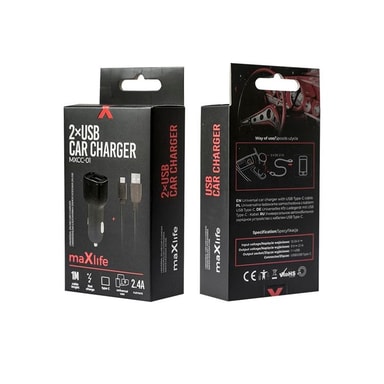 Maxlife Billaddare 2x USB 2.4A med USB-C Kabel MXCC-01 - Svart