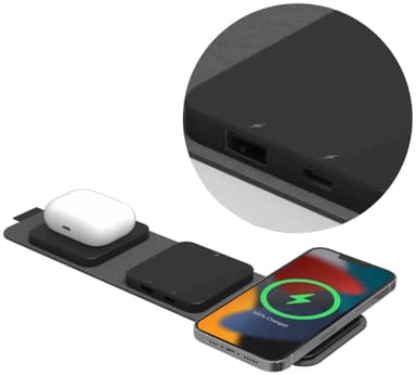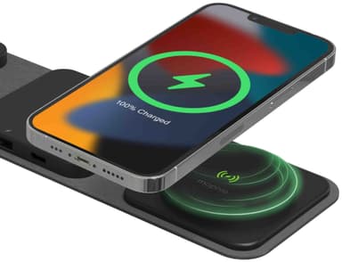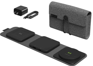 Res var som helst och ladda alla dina enheter på en gång med denna Mophie Snap+ trådlösa reseladdare. Enheter ger upp till 15W för Android och 7,5W för Apples smartphones, och kan ladda din AirPod eller smartwatch med upp till 5W effekt.Läs mer om produkten
