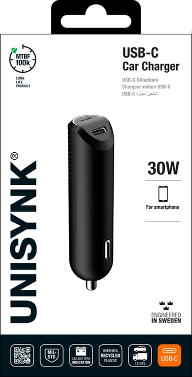 Unisynk 30W USB-C billaddare gör att du kan ladda din enhet när du reser, samtidigt som du kontrollerar bilbatteriets tillstånd tack vare den inbyggda färgkodade LED-ringen. Den är designad för att klara 100 000 non-stop laddning i genomsnitt.Läs mer om produkten