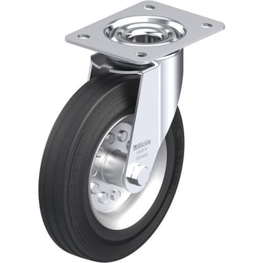 Blickle 277749 Länkhjul i stålplåt, Ø 200 mm Utförande LänkhjulHölje av stålplåt, med dubbelt kullagrad vridkrans · Fastskruvad hjulaxel, förzinkad, kromaterad · Hjul med standard gummidäck · Fälgar i pressad stålplåt · Hjullager.Hjullager ·Läs mer om produkten