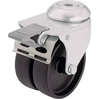 Blickle 285320 Apparat-dubbelt-länkhjul, Ø 75 mm med bulthål och parkeringsbroms. Utförande Dubbelhjul med bulthål ochHölje av pressad stålplåt med dubbelt kullagrad vridkrans · Hjulaxel skruvas fast · Bulthål-Ø: 10,2 mm · Hjul i högklassig polyamidLäs mer om produkten