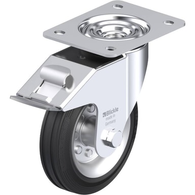 Blickle 532127 Länkhjul i stålplåt, Ø 150 mm med fixering Utförande Länkhjul med fixeringHölje av stålplåt, med dubbelt kullagrad vridkrans · Fastskruvad hjulaxel, förzinkad, kromaterad · Hjul med standard gummidäck · Fälgar i pressad stålplåt ·Läs mer om produkten