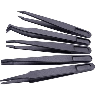 • Fem olika svarta, ledande ESD-pincetter (ytresistans 10^5... 10^6 Ohm) - anpassad med din en 61340-5-1 · Perfekt för arbeten på känslig elektronik och