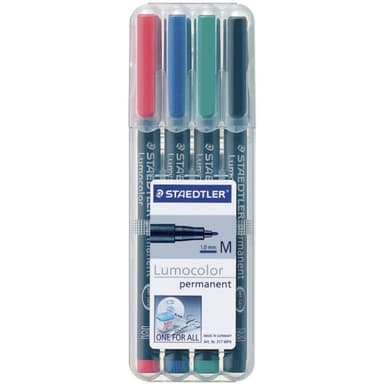 Staedtler Permanent bläckpenna Lumocolor permanent M DRY SAFE Röd, Blå, Grön, Svart vattensäker: Ja 317 WP4DRY SAFE: Kan ligga öppen hela dagen uan att torka ut (testad enligt ISO 554) Utmärkt tork- och vattenbeständig på nästan alla ytor SekundsnabbLäs mer om produkten