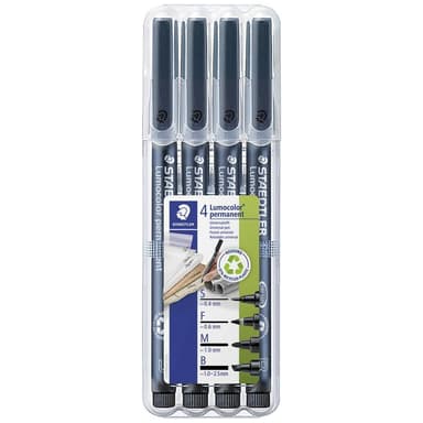 Staedtler Permanent bläckpenna Lumocolor permanent S F M B DRY SAFE Svart vattensäker: Ja 31-9WP4GSDRY SAFE: Kan ligga öppen hela dagen uan att torka ut (testad enligt ISO 554) Utmärkt tork- och vattenbeständig på nästan alla ytor SekundsnabbLäs mer om produkten