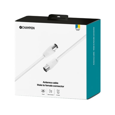 Champions antennkabel är en högklassig kabel med bra skydd mot signalstörningar och ger en utmärkt överföring av TV-signaler. Kabeln har raka kontakter, en hona och en hane för vanlig användning. Kabeln är dubbelskärmad med aluminiumfolie och skärmstrumpa.