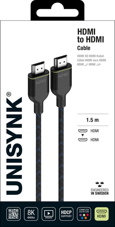 Få ut det bästa av din skärm med en Unisynk 8k60Hz HDMI-kabel. Denna kabel, med 48Gbps bandbredd och HDCP 2.2-stöd, möjliggör överföringar med upp till 8K-kvalitet och 60Hz-uppdateringsfrekvens för din TV och andra skärmar.Läs mer om produkten