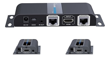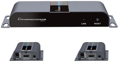 LKV712 är en HDMI-förstärkare/splitter som förlänger en HDMI-signal och splittar den i upp till 40 meter. Från sändaren ansluts två Ethernet-kablar som sedan ansluts till varsinn mottagare upp till 40 meter bort.